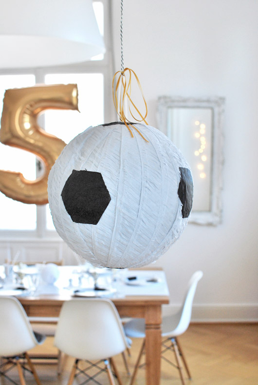 Seitdem die Kindergeburtstags-Queen vor zwei Jahren ihrer Tochter plus Gesellschaft eine Pinata kredenzt hat, geht es bei uns nicht mehr ohne. Ist klar. Mit Pinatas (für amerikanische Familien ein uralter Hut) verhält es sich wie mit Paperstraws, es gibt sie in allen erdenklichen Designs. Hartgesottene basteln sie sogar selbst. Ich wäre in diesem Fall in der Nacht vor dem großen Tag nicht mehr in die Koje gekommen, bzw. hätte bei der Schatzsuche ein Nickerchen im Park einplanen müssen. Daher… Fussball-Pinata von amazon!