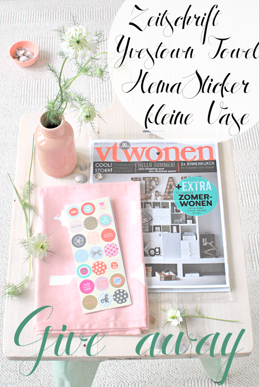 Und nun könnt ihr noch ein Mitbringsel-Päckchen gewinnen. Der Inhalt: eine vt wonen Interior-Zeitschrift (Hinweis: ja! die Zeitschrift ist in holländisch, aber es sind ja die Bilder, die glücklich machen), ein Yvestown Küchentuch von Sissy Boy, eine kleine Tonvase von Sissy Boy und einmal Sticker von HEMA!