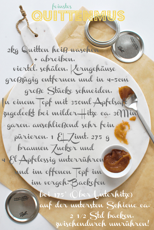 Ein wenig habe ich das Rezept abgewandelt, ihr findet es weiter unten. Außerdem bin ich wieder bei Milas Deli gelandet, denn dort suche ich immer zuerst, wenn ich schon ein paar Zutaten im Kopf habe, aber kein Rezept. Ausgesucht habe ich ihre Marzipanmürbchen und anstelle Äpfeln, surprise, Quitten verwendet. Das Quittenmus kam (wie im Rezept beschrieben) mit Creme fraîche verrührt (zum so löffeln lecker!) auf die Böden der Tartelettes. Aber auch zu Pfannkuchen, Milchreis und Brioche schmeckt es fabelhaft. Bis zum Verzehr wohnt das Mus in den schönen Einmachgläsern von Ball Mason, diese haben hier bei uns Premiere gefeiert. Im Sinne von “guten Freunden gibt man ein Müschen” eignen sie sich hervorragend zum verschenken, noch schöner… den entsprechenden Blumendeckel dazubinden, so kann der/ die Beschenkte das Glas später als Trinkglas verwenden. Neben den Gläsern und der kleinen Tortenplatte habe ich den zum Thema passenden Ball Mason Stempel bei Blueboxtree entdeckt. Das große Stempelbild ist ein echter Hingucker und vielseitig einsetzbar, da das kleine Etikett unbeschriftet ist und sich beliebig Namen, Mottos, Nachrichten einsetzen lassen. Da kommen einem doch gleich ganz viele Ideen, oder?