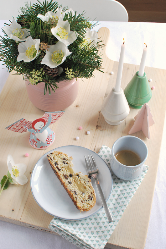 this week I was shouting with glee when I received the world-beating Christmas stollen of my dear friend and a beautiful paper-angel-advent-greeting by mail. I have to enjoy the first slice all by myself in the early morning, before my family discovers the sweet present and only watched by my new little angel-pal 🙂